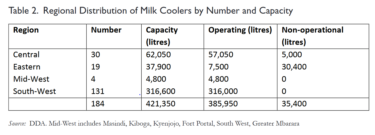 Early development initiatives in the dairy sector targeted South Western and Western zones which were popularly referred to as the Mbarara Milk Shade Area. These initiatives mainly rehabilitated milk coolers and supplied generators where between 1987 and 1991, the Dairy Corporation alone established 42 milk collection centres with (about 2000 litre) milk coolers and generators in the region financed by the African Development Bank.