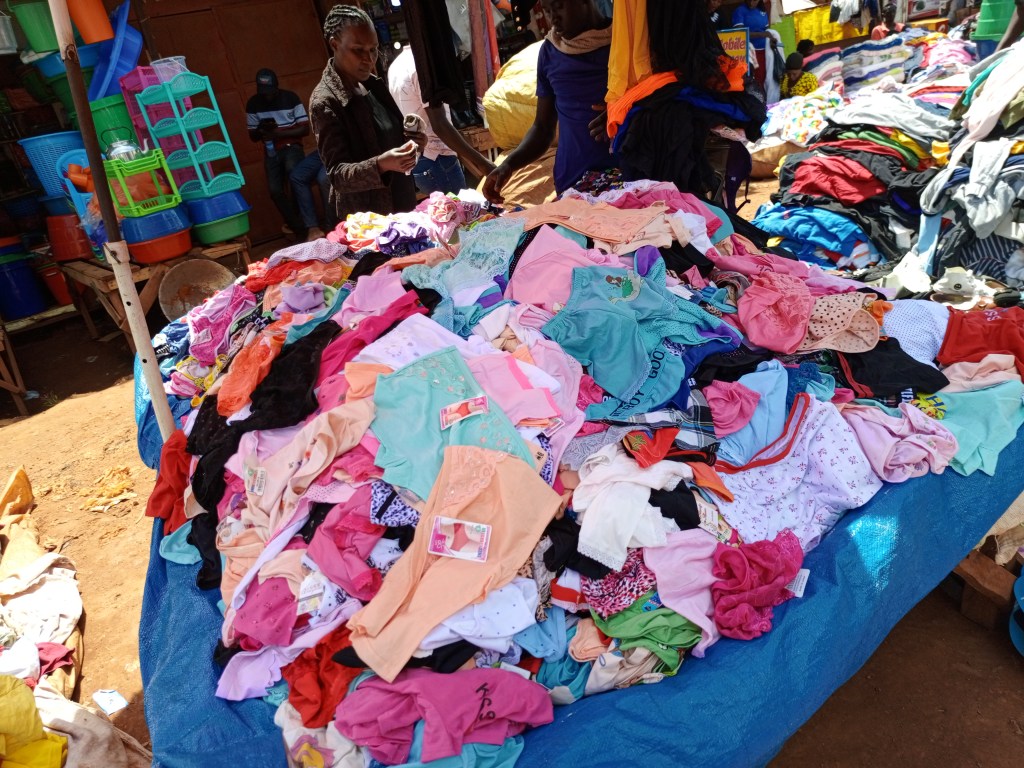 “Nkumi bbiri skirt, Lukumi blouse, Lukumi nicker, Lukumi akaleega!!” (Two thousand a skirt, One thousand a blouse, One thousand a nicker, One thousand Bra). I could hardly believe my ears. Basically with 5,000/= (1.5 dollars), a lady can get dressed fully from head to toe. This forced me to take a closer look and indeed realised that it was not a joke.